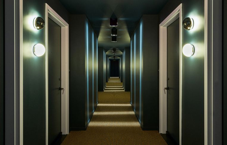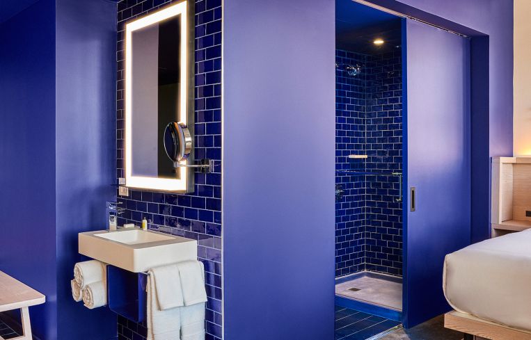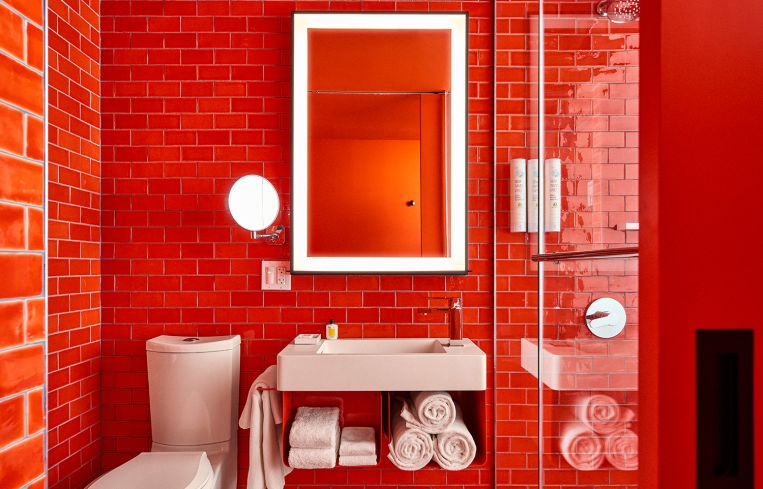 The interiors are just as distinct. The hotel rooms are themed around different primary colors to match the facade, with the bathrooms tiled and painted in bright primary shades. One suite of rooms has royal blue bathrooms, with matching tile, ceilings, floors, shelves and even the bathroom’s exterior wall; another group of rooms has bright red bathrooms, and a third is bright yellow. The hotel rooms are outfitted in midcentury-inspired, light wood furniture that tends toward the modular, particularly in smaller, pod-sized rooms.