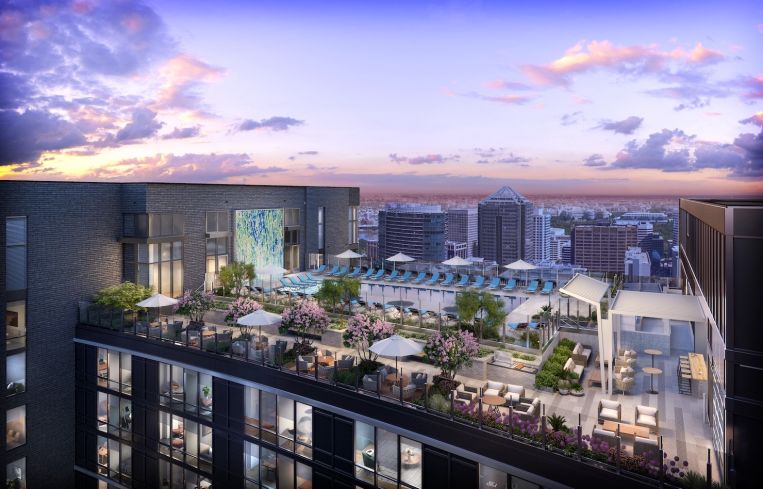 Located at 1771 North Pierce Street, the 29-story Evo features more than 30,000 square feet of amenity space, including a rock climbing wall, a multisport simulator, a dart alley, a coworking hub, conference rooms, a rooftop pool and garden terraces, according to a statement.