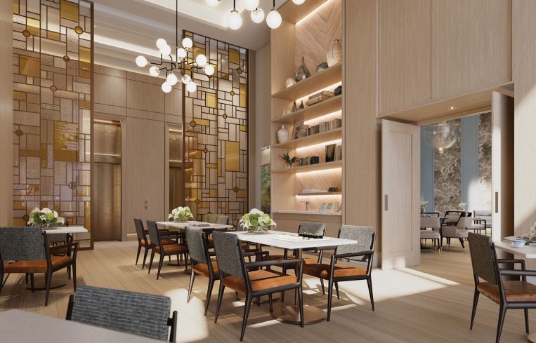 Together with SLCE Architects and Champalimaud Design, the developers have kitted out the 156-unit building with blond wood paneling, stained-glass touches and white marble. The materials aim more for the feel of high-end condominiums than senior living. And the new property — dubbed the Apsley — will be very pricey, too: studios start at $17,000 a month, two-batedrooms at $22,450, and, for memory care, the monthly prices are $23,500 for a studio and $31,800 for a two-