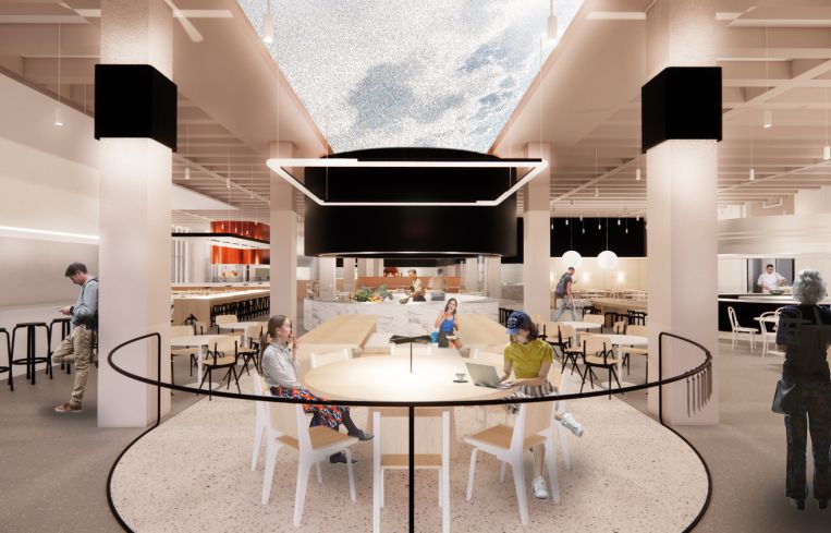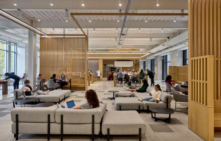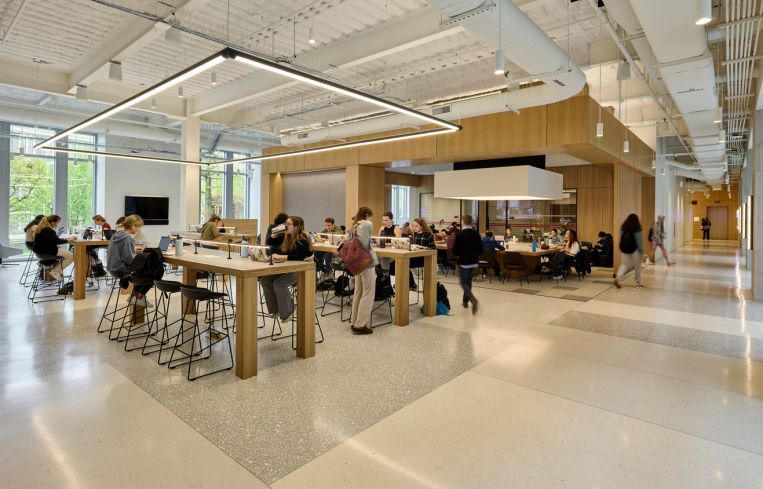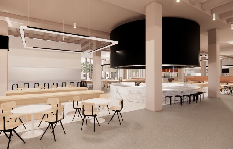 Phase three will include a spacious new cafeteria, complete with light wooden tables and chairs, some of which will be equipped with lamps and outlets for study sessions. Several open, circular serving stations for different kinds of cuisine will be scattered throughout the space, so students will be able to watch chefs prepare vegan food, salads, sandwiches, pizza, halal food and gluten-free options. One serving counter consists of a perfectly round, white, freestanding counter and a round, black overhang, while another is more oval, with both the overhang and the countertop clad in a shiny copper metal. A large LED screen will cover part of the cafeteria ceiling, which could be programmed with art or function as a digital skylight.