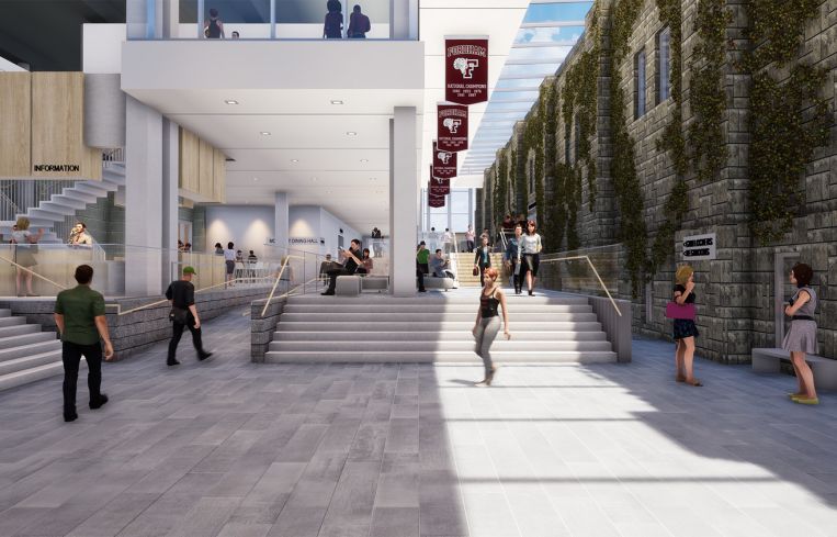 HLW wanted to bring that energy to the new 250,000-square-foot campus center with a glassed-in entry and central arcade, which will link the three existing buildings — the Lombardi Center, which has a pool and a running track; the McGinley Center, which has a cafeteria, event spaces, lounges and a fitness center; and the 3,200-seat basketball court and arena in the Rose Hill Gymnasium.