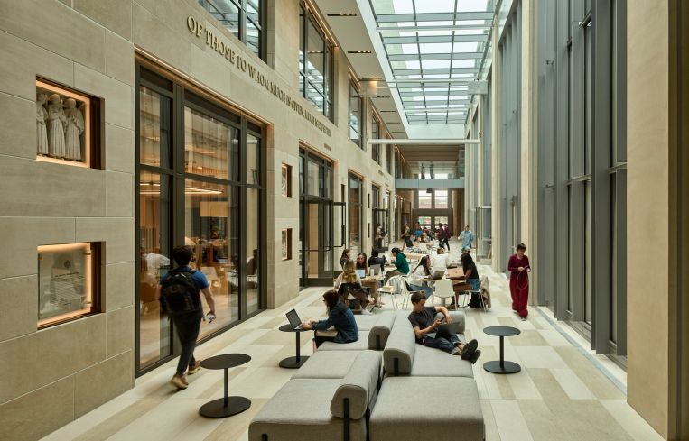 The second phase of the project, under construction now, includes the new, sunlit arcade, incorporating existing exposed stone walls from the gym, a squat Gothic building constructed in 1925. The arcade will include green walls, couches and a raised seating area with tables and chairs, along with wide staircases leading into the gym, the student center and an entrance to the pool. HLW even custom-designed different kinds of signage to help students navigate the space, because it leads to so many different parts of the complex.