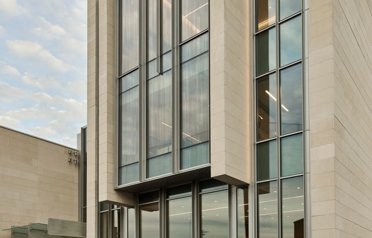 The addition involved adding a new exterior to the building, complete with floor-to-ceiling strips of windows that extend vertically along the entire length of the facade, interspersed with stacks of gray brick. A new five-story tower was added to the right side of the student center, featuring glass facade panels sandwiched between two large panels of white limestone, one side of which has been engraved with the university’s seal.