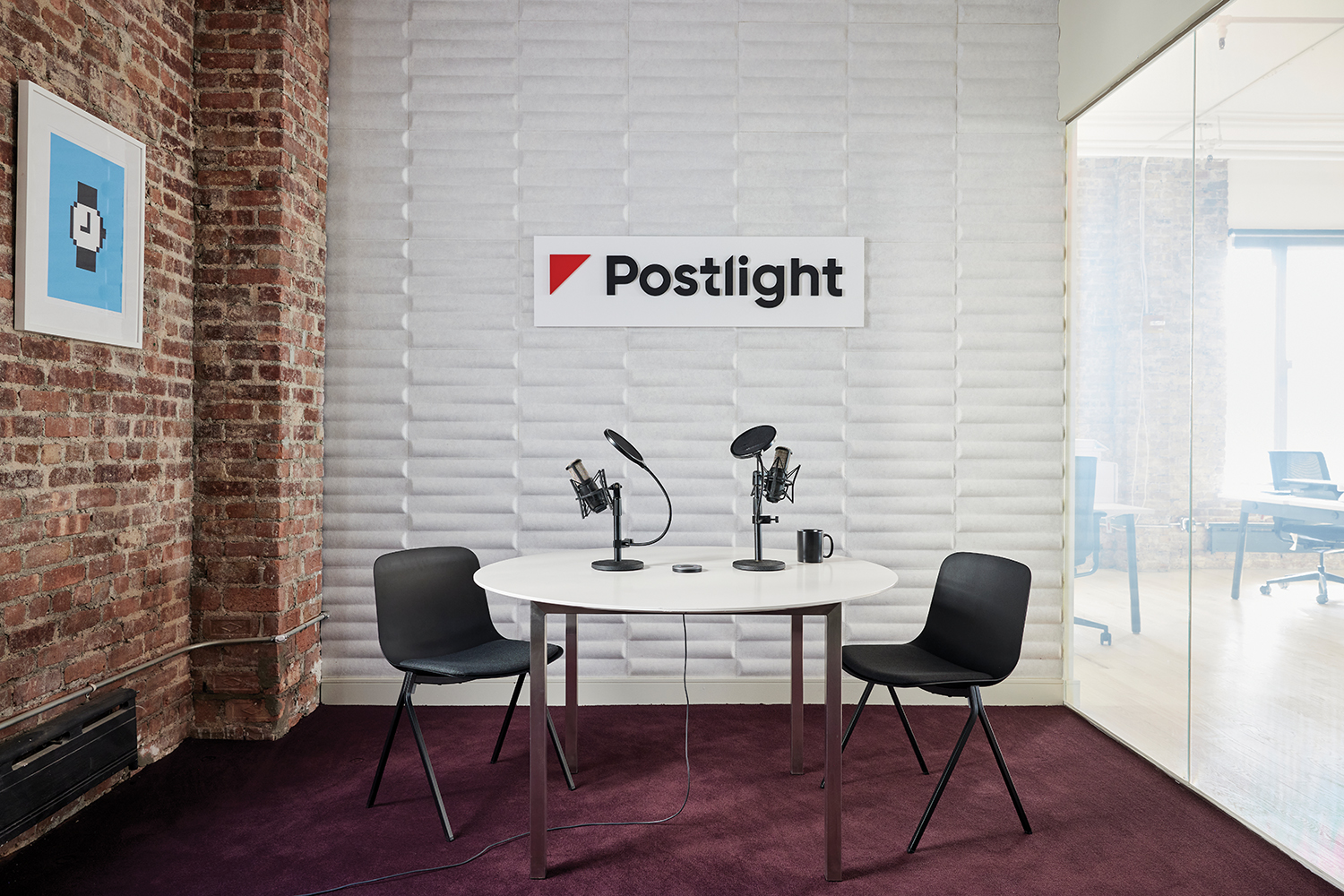 Toward the back are 14 unassigned desks that employees can use, a small private meeting room, and a small conference room that’s been transformed into a podcast studio. One wall features white acoustic paneling, another is exposed brick, and the glassed-in portion that faces the rest of the office is made of “smart glass” that can be made more or less opaque.
