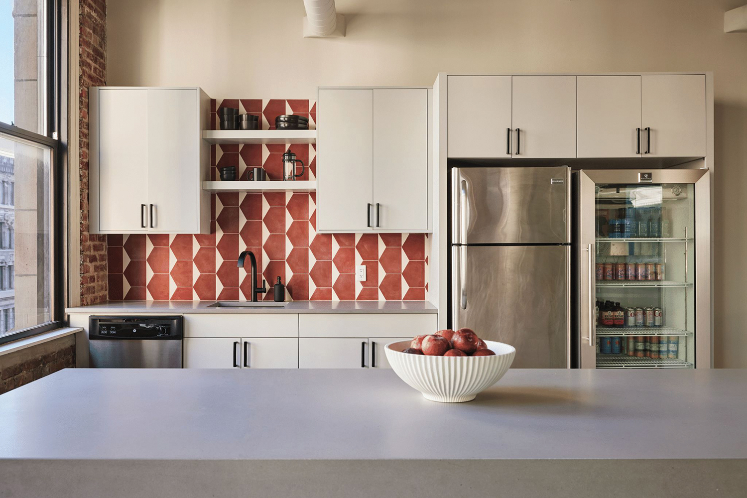The kitchen area has also been redone, with a red-and-white backsplash above the sink, white cabinets and gray stone countertops. There’s also an open cafe area with a long, dark gray upholstered banquette, white marble-topped tables and white chairs.