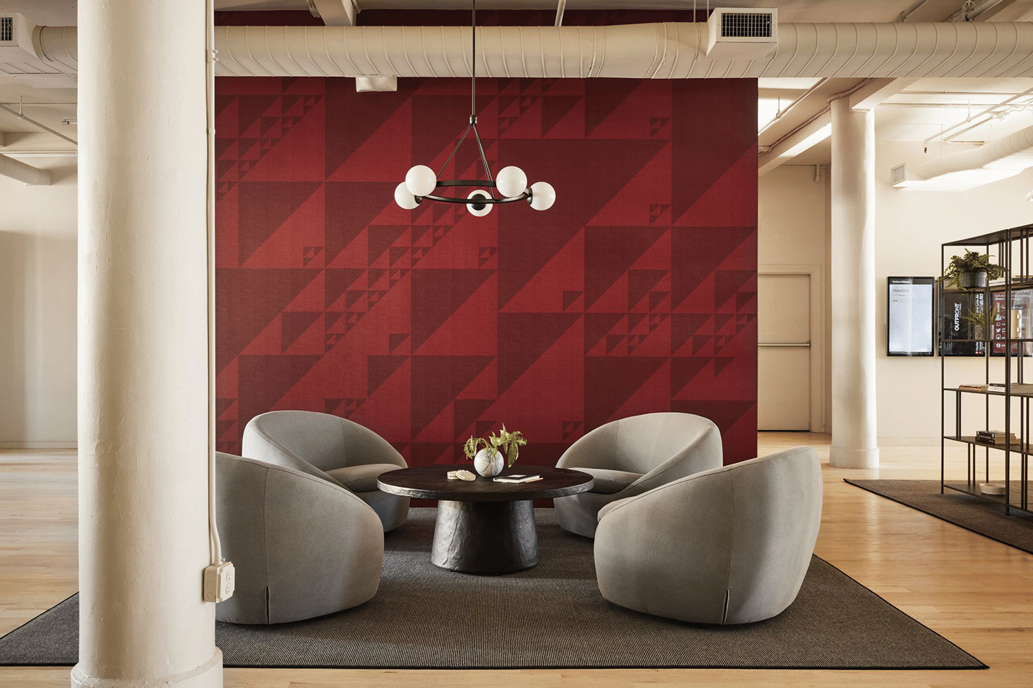 After getting off the elevators, there’s an awkwardly placed nook with a column right by the entrance to the office. Since it couldn’t be moved, Magriñá transformed it into a seating area for the reception desk, complete with red walls emblazoned with the company’s geometric logo, simple gray couches and a wall of potted plants. Rounding out the space is a white neon sign on the wall that reads “Postlight,” along with red carpeting and red ceilings. Even the column has been painted red.