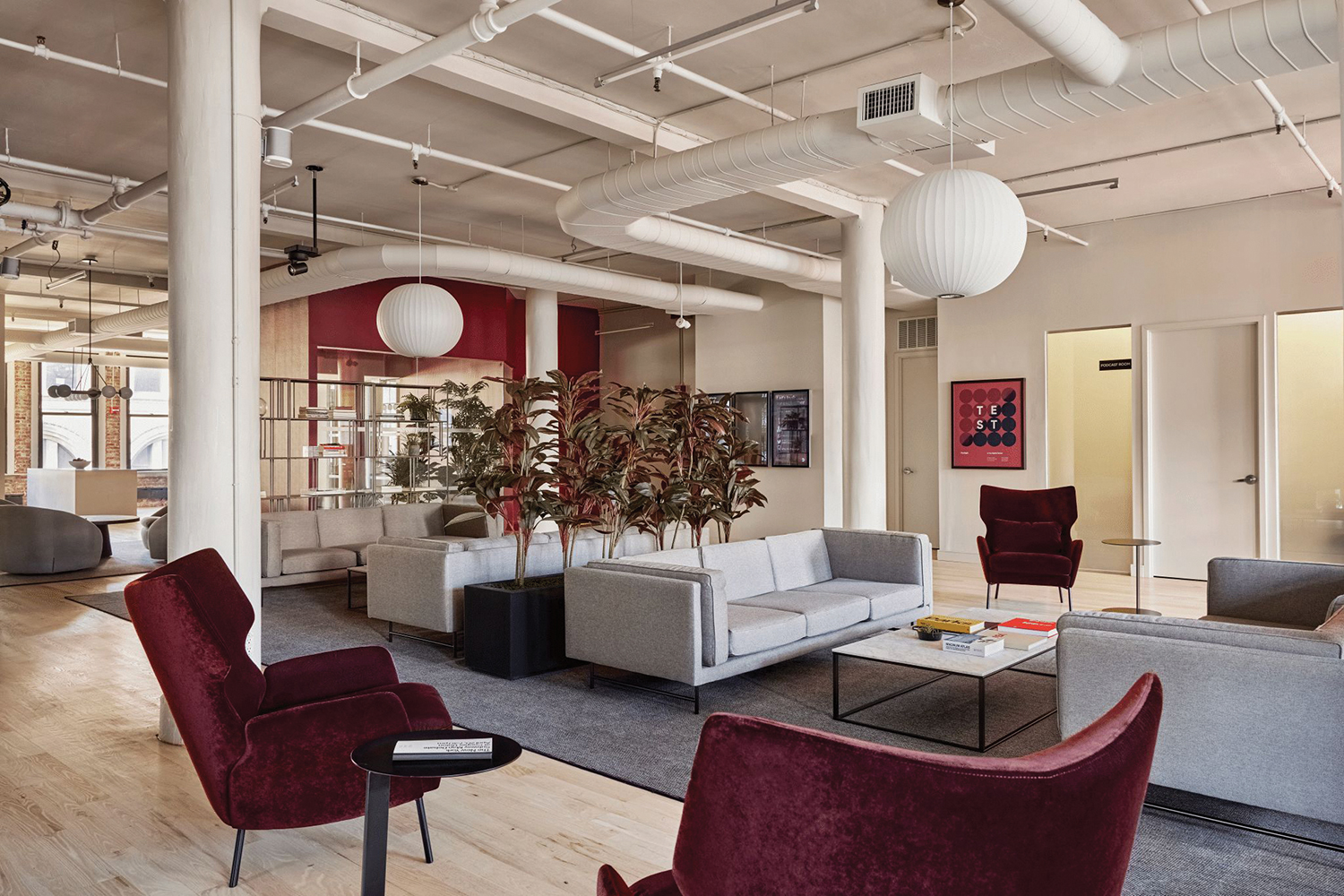 Then there’s a series of lounge areas with low gray couches, white marble-topped Midcentury coffee tables, and maroon armchairs. TVs hung on the wall, along with cameras and microphones, allow lounges to be used for video conferencing.