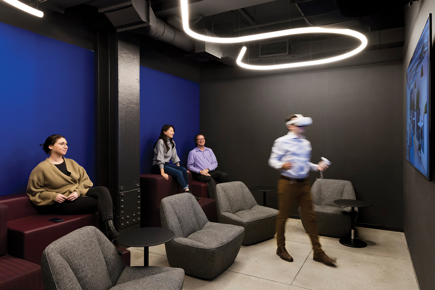 On the other side of the entryway lounge is a long, glassed-in conference room, and behind it is the rest of the office. That includes more glassed-in meeting rooms of various sizes, including one with a wall that has been converted to a floor-to-ceiling whiteboard surrounded by dark blue armchairs. There’s also a fully enclosed room with a virtual reality headset where designers can interact with environments in 3D; small work rooms with a desk, chair and monitor; and Spector’s bare bones office, which doubles as a small meeting room. Rounding out the office is the pantry, which is outfitted with white marble countertops and blonde wood cabinetry, a lactation room with a fridge and sink, and the main open workstation area.
