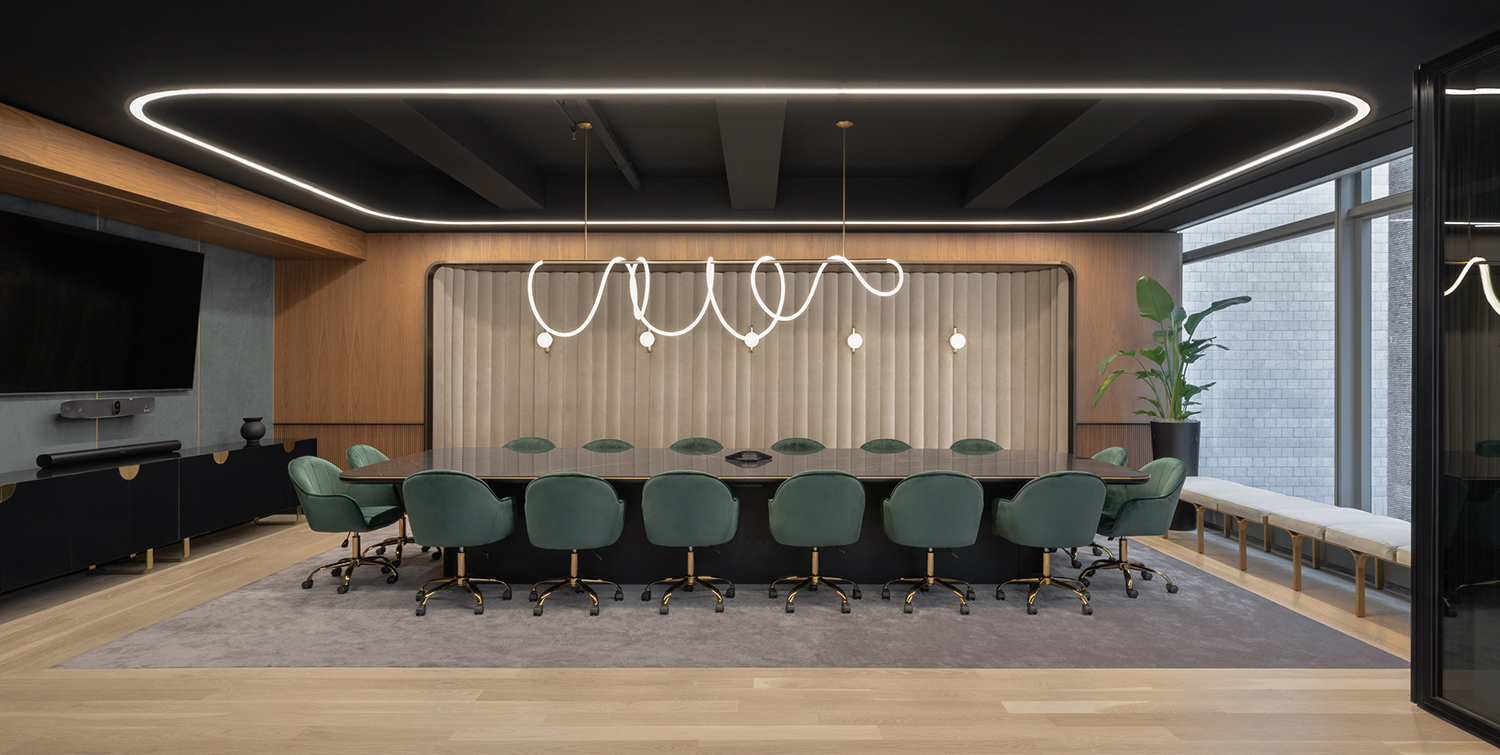 The boardroom includes a long table topped with black marble, green velvet swivel chairs, wood-paneled walls and a unique suspended light fixture with loops of LED tubing wrapped around a long brass rod.