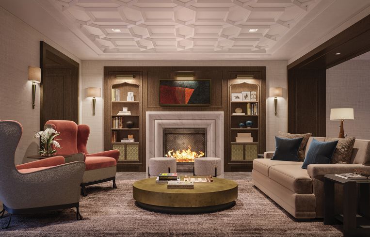 Part of the challenge involved protecting and rehabilitating some of the historic structures located a few feet from the new condo tower. The seminary’s former refectory — a dining hall — has been converted to a pool. The refectory itself is faced with the same gray stone as the rest of the campus, and has unique timber beams along the ceiling. CetraRuddy designed the amenity areas, including the pool, and tried to keep the refectory’s historic elements.