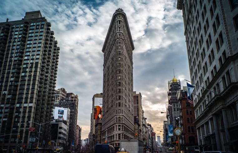 Completed in 1902, the Flatiron Building was constructed on a triangle-shaped lot formed as Broadway slices diagonally through the intersection of Fifth Avenue and 23rd Street, leading to the structure’s signature three-sided profile. It is both a city and national historic landmark, and was one of New York’s first skyscrapers.