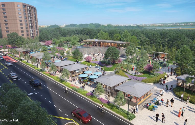 The roughly 1.6-acre Water Park will complement the neighborhood’s broader redevelopment efforts, according to JBG Smith, which is slated to deliver more than 5,000 new multifamily units. Of those, 1,583 are already under construction. Next month, Amazon will open its 2.1 million-square-foot headquarters there, which will house the more than 8,000 local employees it has hired to date.