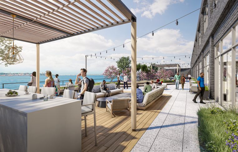 The building — at 14 53rd Street on the Brooklyn waterfront — includes 30,000 square feet of indoor and outdoor amenities, plus a shuttle to the subway.