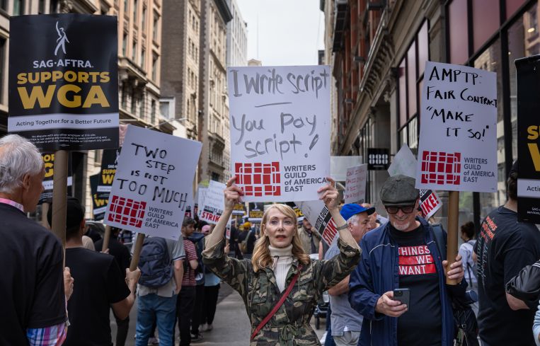 On May 2, Writers Guild of America members formed picket lines at several Los Angeles studio headquarters after the Alliance of Motion Picture & Television Producers refused to grant mandatory staffing minimums, guaranteed weeks of employment, and higher wages.