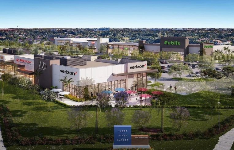 Situated on 13.2 acres at 16000 and 16040 Pines Boulevard, the 135,000-square-foot shopping plaza is fully leased, according to Terra, which completed the development last year. The development is anchored by Publix, and other tenants include Crunch Fitness, Burlington, Cheddar’s Scratch Kitchen, Jersey Mike’s Subs and MD-Now Urgent Care Center.