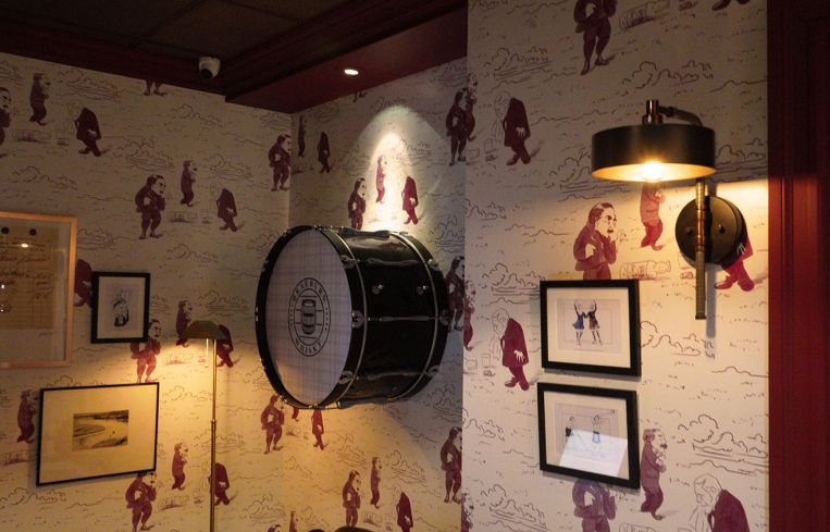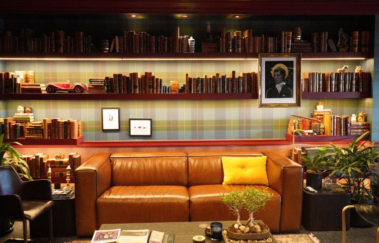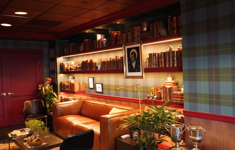 The entry and reception area features floor-to-ceiling glass doors with brass handles, and red curtains have been hung on the other side to add a bit of mystery. Written on the doors, in small gold script, is something like the company’s motto: “an investment in your experience.” The space is across the street from Carnegie Hall, and the wallpaper in the reception area is in fact a print that came from Carnegie Hall’s museum, featuring a mustachioed man crying over his last bottle of whisky.