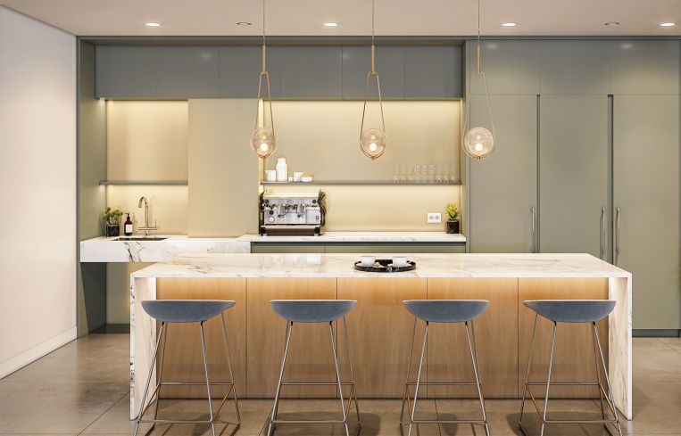 Other updates include the amenity center, which occupies the entire 15th floor and houses a glassed-in gym, a small open lounge and a juice bar. Roughly half the building will be prebuilt suites, which include industrial touches such as cone-shaped metal light fixtures, polished concrete floors and open ceilings with acoustical panels for sound dampening. White marble countertops and gray-green cabinets with built-in appliances round out the pantry and kitchen areas. Construction is set to wrap in the next month or so.
