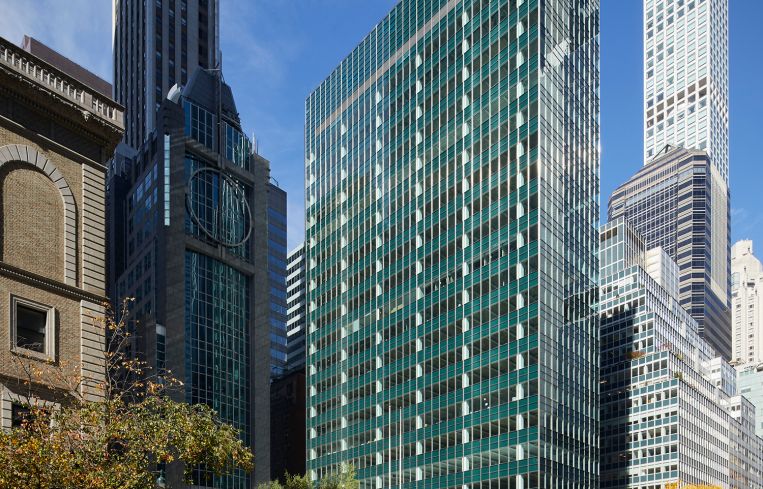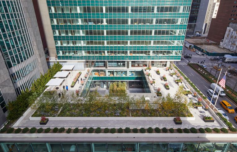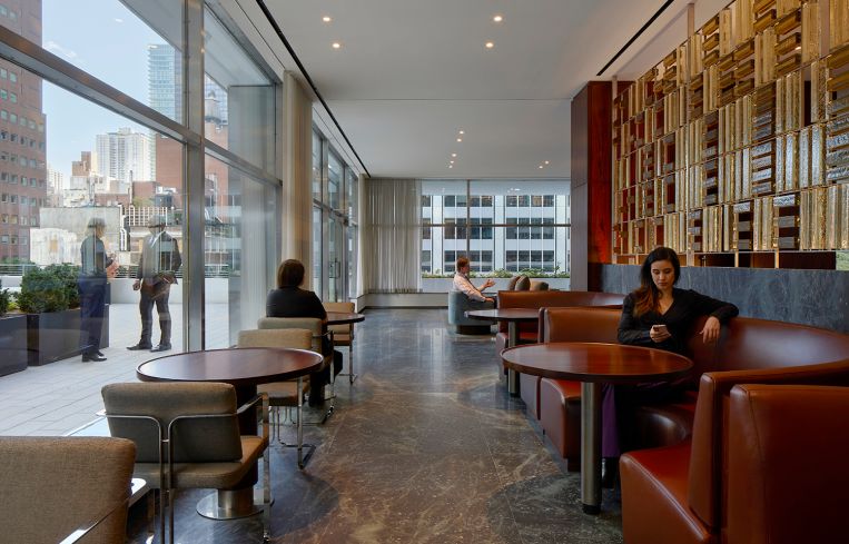 On the third floor, the designers at Marmol Radziner created a new lounge for tenants, with dark green marble floors and walls; dark brown, square pedestal tables; custom couches and armchairs in soft browns and green-grays; and a long bar separated by a wall of translucent glass panels. Sant Ambroeus, the hospitality group that runs the Casa Lever restaurant downstairs, will serve a selection of coffee, light snacks and cocktails from the bar throughout the day. The large terraces overlooking Park Avenue on both sides of the floor have been furnished with off-white upholstered couches and chairs, low metal tables, and plenty of plantings.
