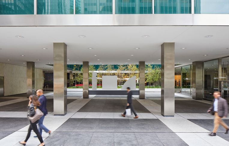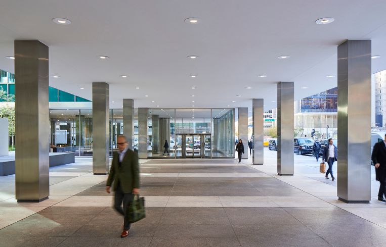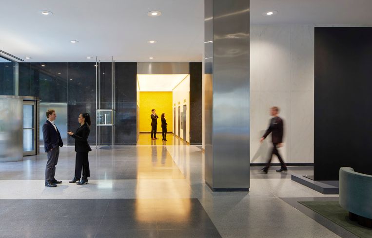 RFR undertook a modest restoration of the building’s glass curtain wall in 2000, but much of the building’s interior was still in rough shape 20 years later. There were cracked pavers in the public plaza, pitted travertine floors in the lobby, a yellow glass accent wall filled in with ugly grout, and white marble by the elevators coated in a thick, yellowed polish. The once tony and modern headquarters of the Lever Brothers soap company—the predecessor of Unilever—wasn’t looking so fresh and clean.