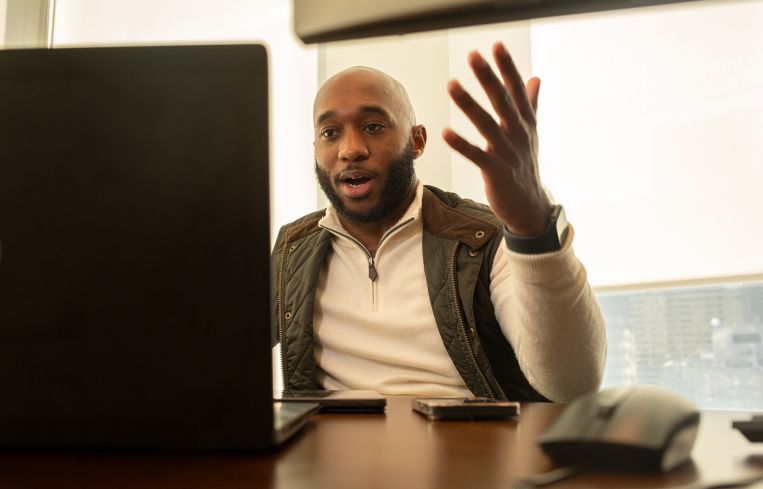 Hancock now heads into another office. From the 30th floor, striking views of the skyscrapers of Seventh Avenue and Times Square open up behind Hancock as he holds court over Zoom with Tyson Pratcher, senior managing director at Artemis.