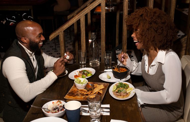 The pair sit down for tacos, green beans, chips and guac, and tortilla soup.