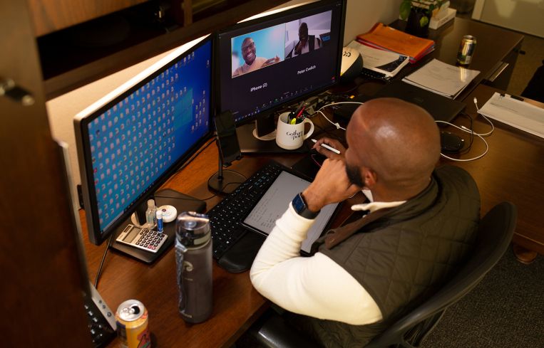 Hancock returns to his office and commences a Zoom meeting with Ade Sanusi, vice president of The Integral Group, a Black-owned development firm headquartered in Atlanta.