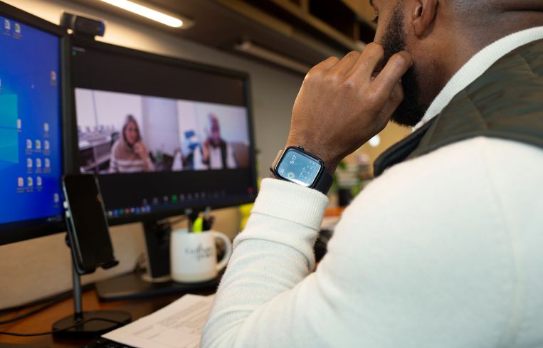 Aaron and Geter reunite to take a Zoom meeting in the firm’s conference room with the three young analysts the firm recently hired.