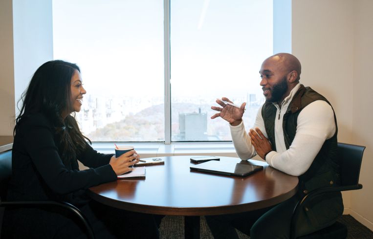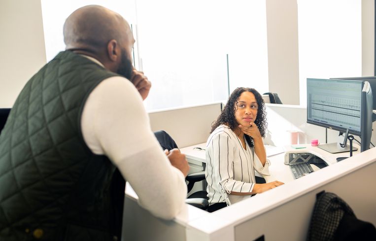 Hancock walks over to the bullpen to have a quick chat with Elyshia Geter, senior associate at Artemis. Geter and Hancock discuss the cash-flow models on a hypothetical deal sheet a trio of young Artemis junior analysts completed the previous week.