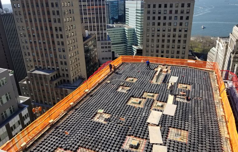 Mark Plechaty, a principal at DeSimone, said they kept some areas solid concrete, particularly where structural columns punched through the floors. “The midsection of the concrete was just a solid slab,” he explained. “You can cast in this recycled plastic bubble, and it eliminates the concrete. Everywhere else is this voided construction, which can reduce the overall weight by one-third.”