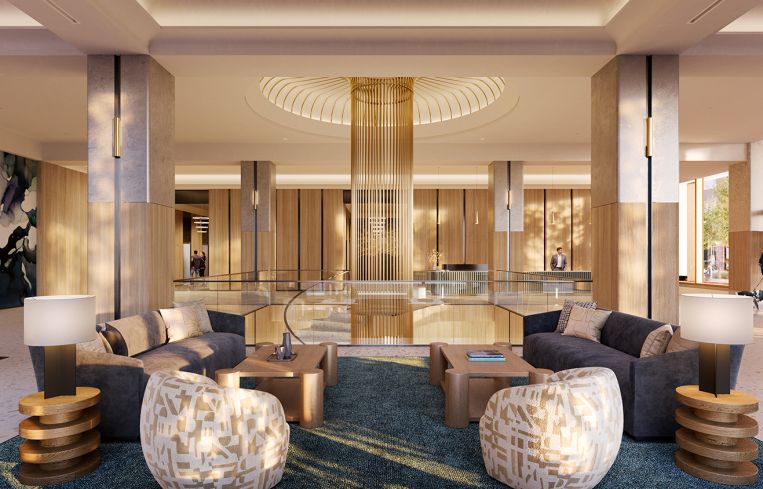 The lobby is an open lounge with a coffee bar, concierge check-in, seating and a spiral stair that leads to the basement. Downstairs is a bowling alley, a gym, a spa with plunge pools, a children’s playroom and small event rooms.