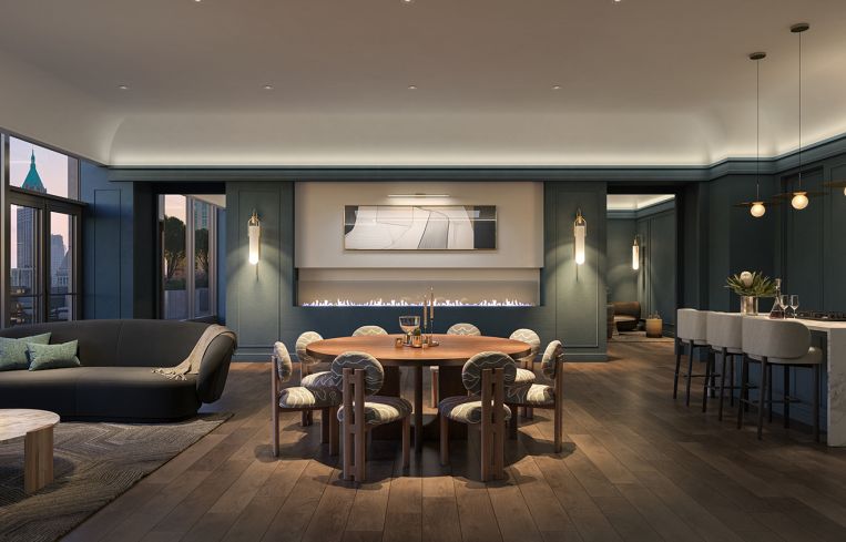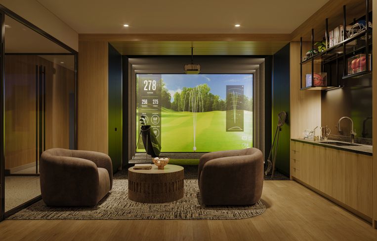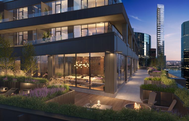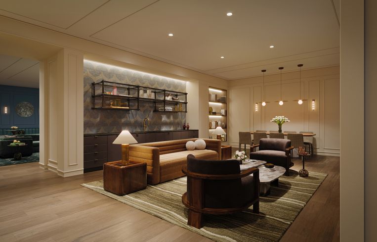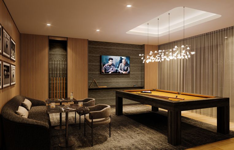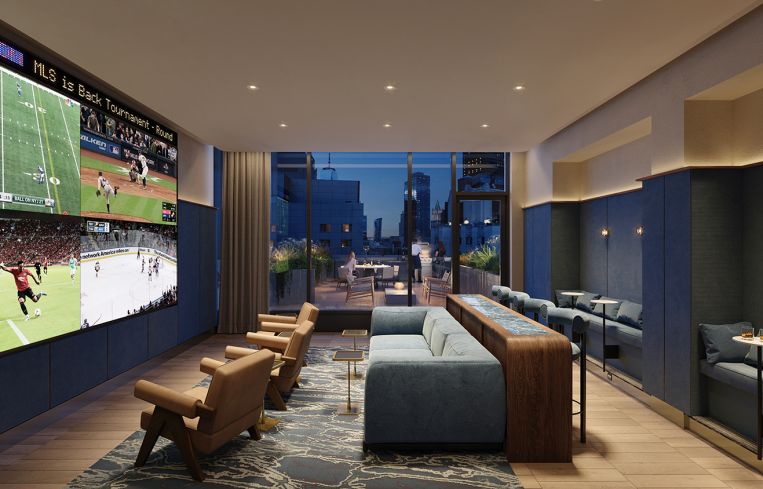 The addition is set back from the building’s original edge, allowing for an amenity floor with a large wraparound terrace, a party room with a bar, phone rooms with equipment for video calls, and a sportsbook room with multiple TVs for betting on games. Although the sportsbook space is an unusual amenity, Fuller said that Vanbarton specifically requested it.