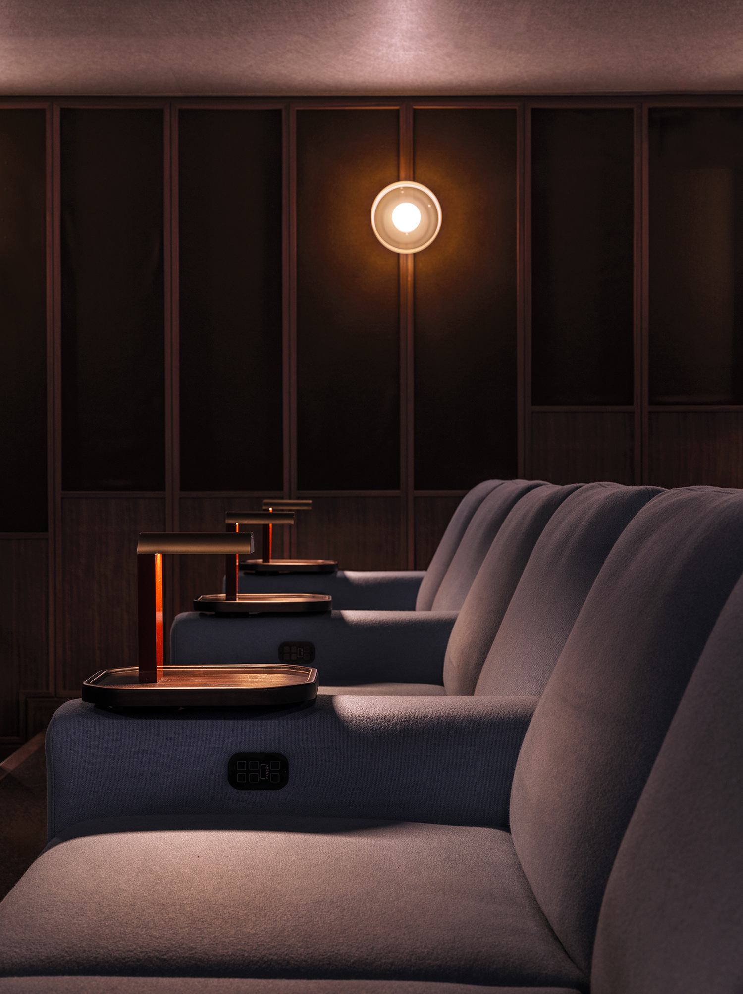 designed reclining theater chairs. Between the chairs are little tables with dim LED lamps, which shine just enough for viewers to jot down notes during films. The sound designers achieved acoustic isolation by making the walls two feet thick on either side and raising the floor six inches.