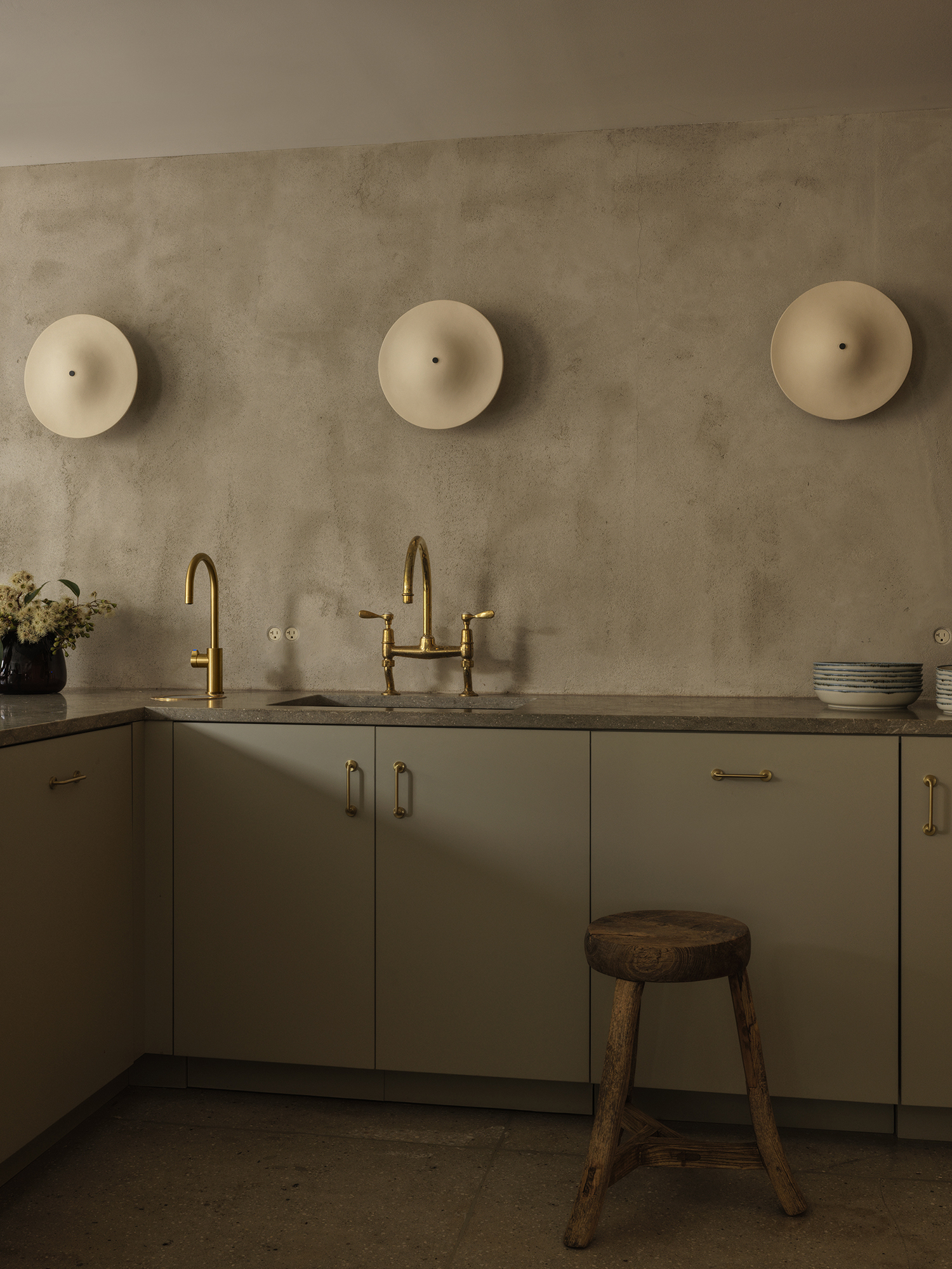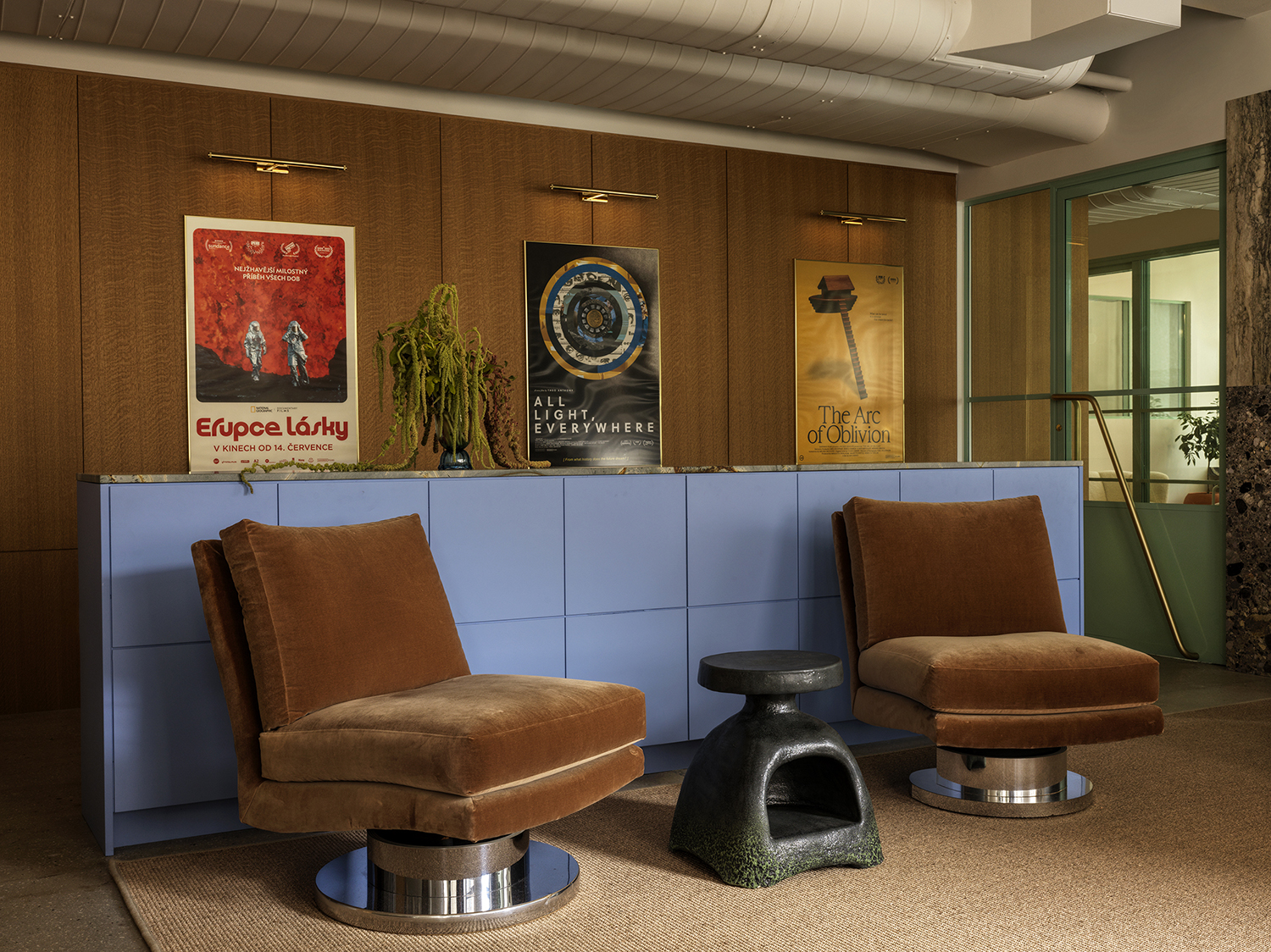The reception area for events also doubles as a regular workday lounge, and it includes a custom-designed, double-sided, upholstered brown couch with built-in work lamps between the seats on either side. Next to it is a small meeting area separated by sliding, mint green doors with large windows, outfitted with vintage, Scandinavian-style wooden chairs and a round, cream-colored table.
