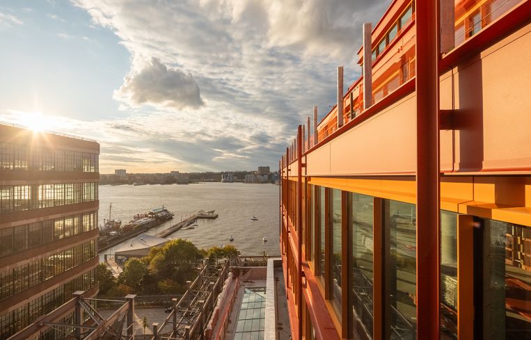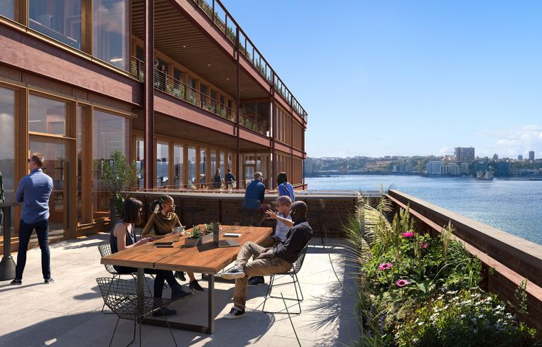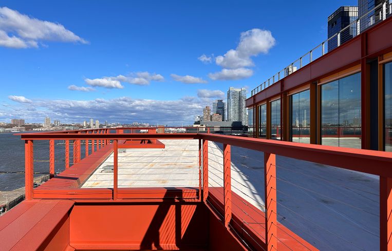 The terraces, also framed by rails painted the same red, overlook a courtyard full of trees, brick flooring and seating as well as the Hudson River. There’s a whopping 110,000 square feet of outdoor space within the building, which includes terraces on multiple floors, and a large wraparound terrace shared among tenants on the eighth floor.
