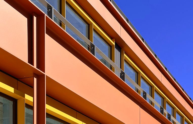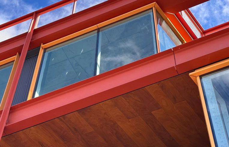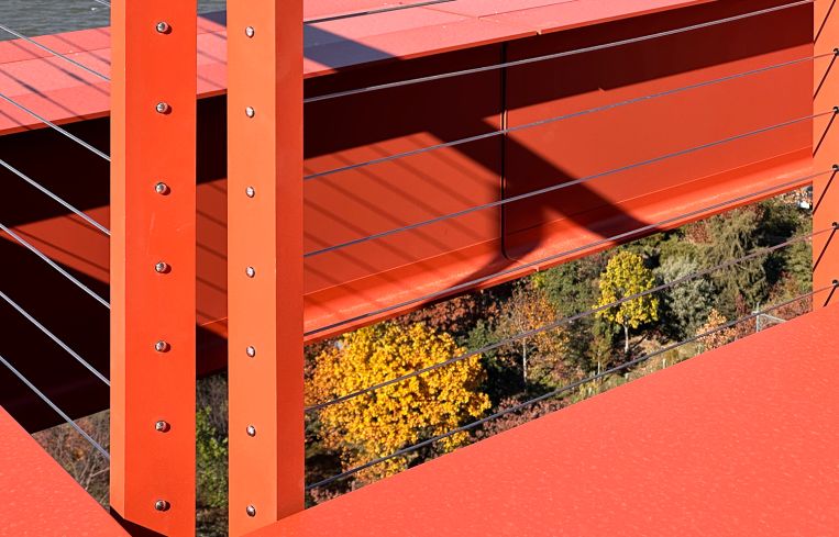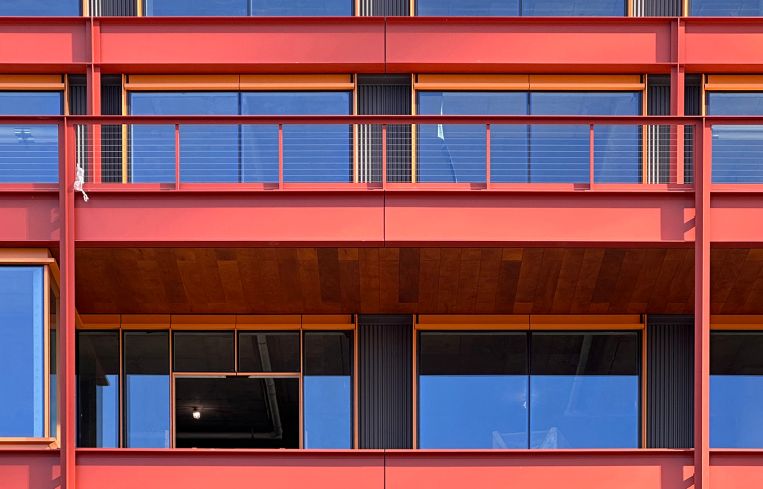 The colors of the addition, too, are modeled on the colors of New York Central Railroad’s freight cars, with fire engine red aluminum beams and facade panels as well as canary yellow accent pieces around the windows. CookFox also tried to incorporate heavy timber joists and wood decking in the construction, in a nod to the warehouse’s original heavy timber and brick construction. Wood paneling is visible along the ceilings of the covered terraces, for example.