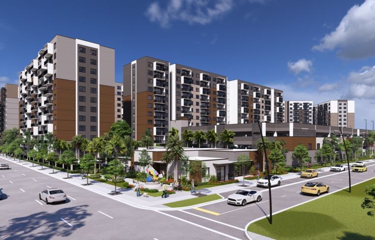 The residential component would span five 12-story residential buildings at 15780 W Dixie Highway, just west of a Teco gas plant. The 575,000-square-foot development would include three pools, three clubhouses and 1,709 parking spaces within three garages, which would house retail space on their ground floors.