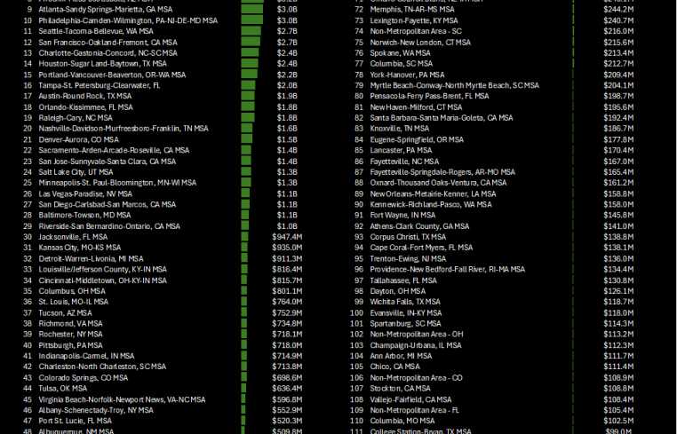 • Overall trends: Total loan originations across the top 25 MSAs exceed $50 billion, with an average implied loan to value (LTV) around 60 to 65 percent, based on comps. Smaller markets like Raleigh, N.C., (ranked 19th) and Nashville (ranked 20th) show emerging potential, with property values growing due to tech and entertainment sectors.