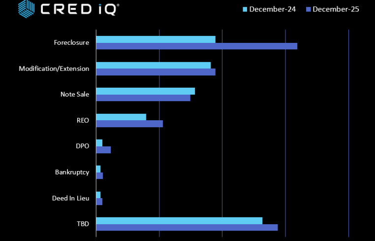 Special servicer workout strategies have shifted materially year-over-year, signaling a more decisive posture toward resolution rather than prolonged interim remedies, according to CRED iQ. Comparing December 2025 to December 2024, the most notable development is the sharp increase in foreclosures, which now dominate the workout pipeline.