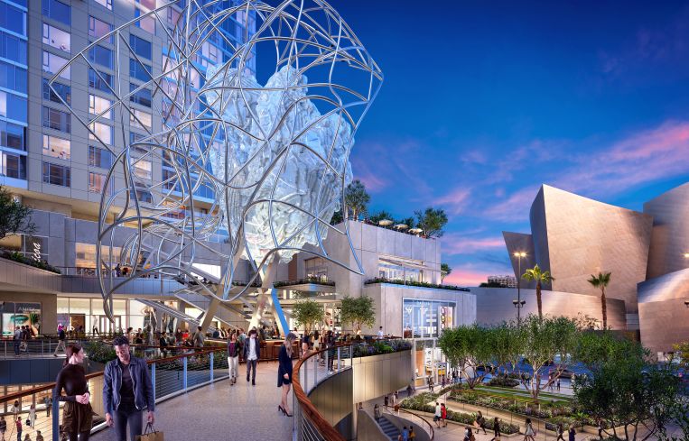 The Grand Courtyard at Twilight with Frank Gehry Sculpture ( Courtesy of Related – CORE)